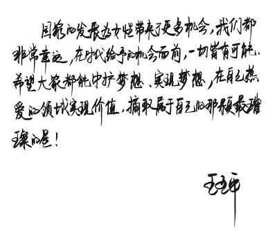 “中国航天的崛起和中国女性在科技领域的深度参与,可以为其他国家提供一种经验、一个样本:科技和世界都因女性力量的推动而越来越好。”借此历史机遇,王亚平鼓励所有女性:“希望大家能够守护梦想、实现梦想,在自己热爱的领域实现价值,摘取最璀璨的星!”