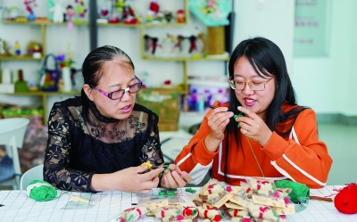 10月10日,两名手艺人在“春巧巧”妇女手工项目传承实践基地交流“参仙”编织经验。