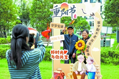 10月21日,青年志愿者给金婚老人拍合影。 10月21日,浙江省湖州市长兴县泗安镇社会救助服务联合体组织青年志愿者们在双联村丰联佳苑小区开展迎重阳敬老助老活动。青年志愿者们通过志愿服务,弘扬尊老敬老传统美德,传递温暖。新华社记者 徐昱/摄